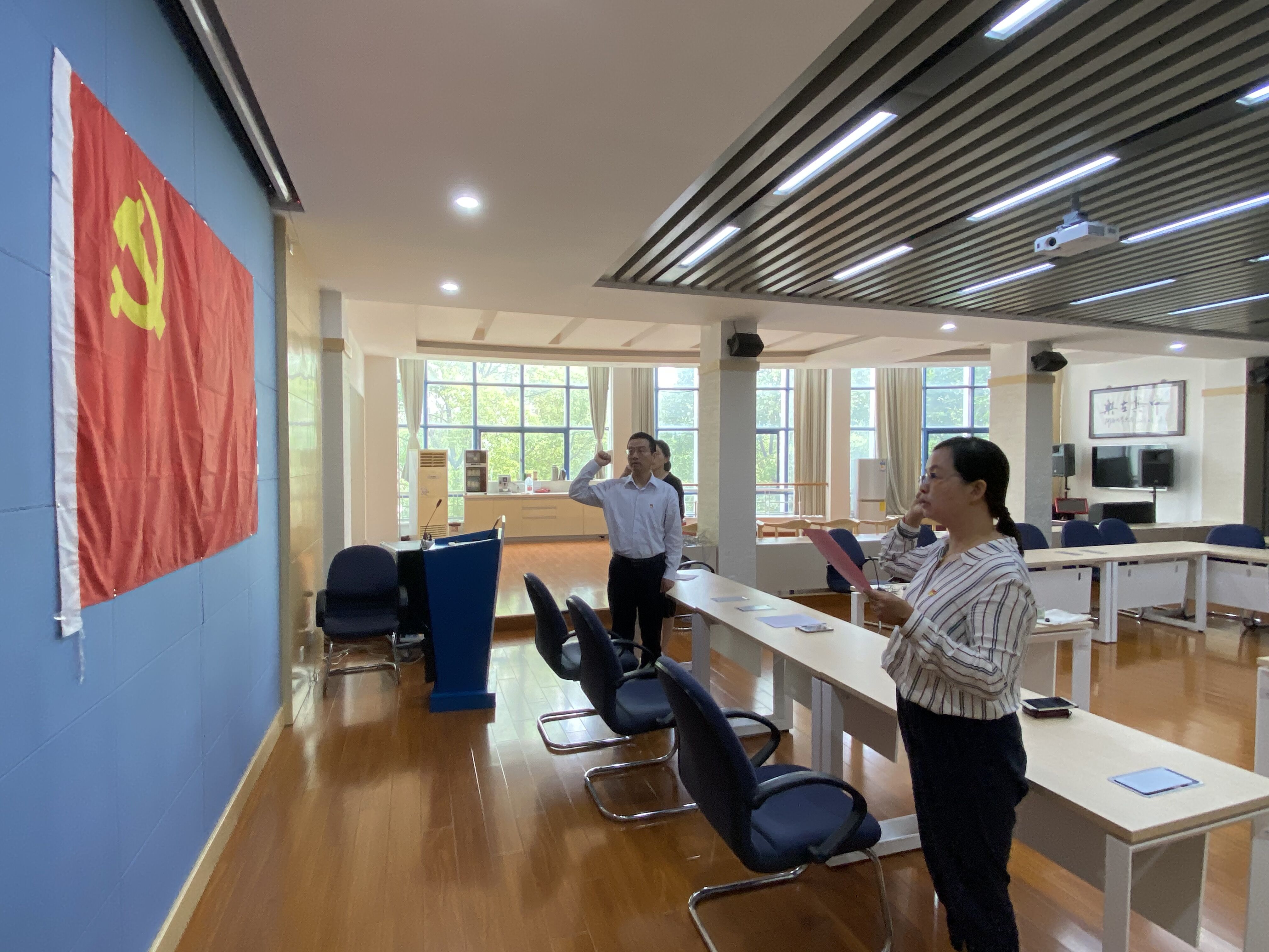 宣誓活动在《国际歌》中拉开帷幕。学院党委副书记张炜老师带领全体党员面向党旗庄严宣誓,在誓词中,大家共同感受初心与使命之重,感受砥砺前行、继续奋斗的历史召唤和时代责任。