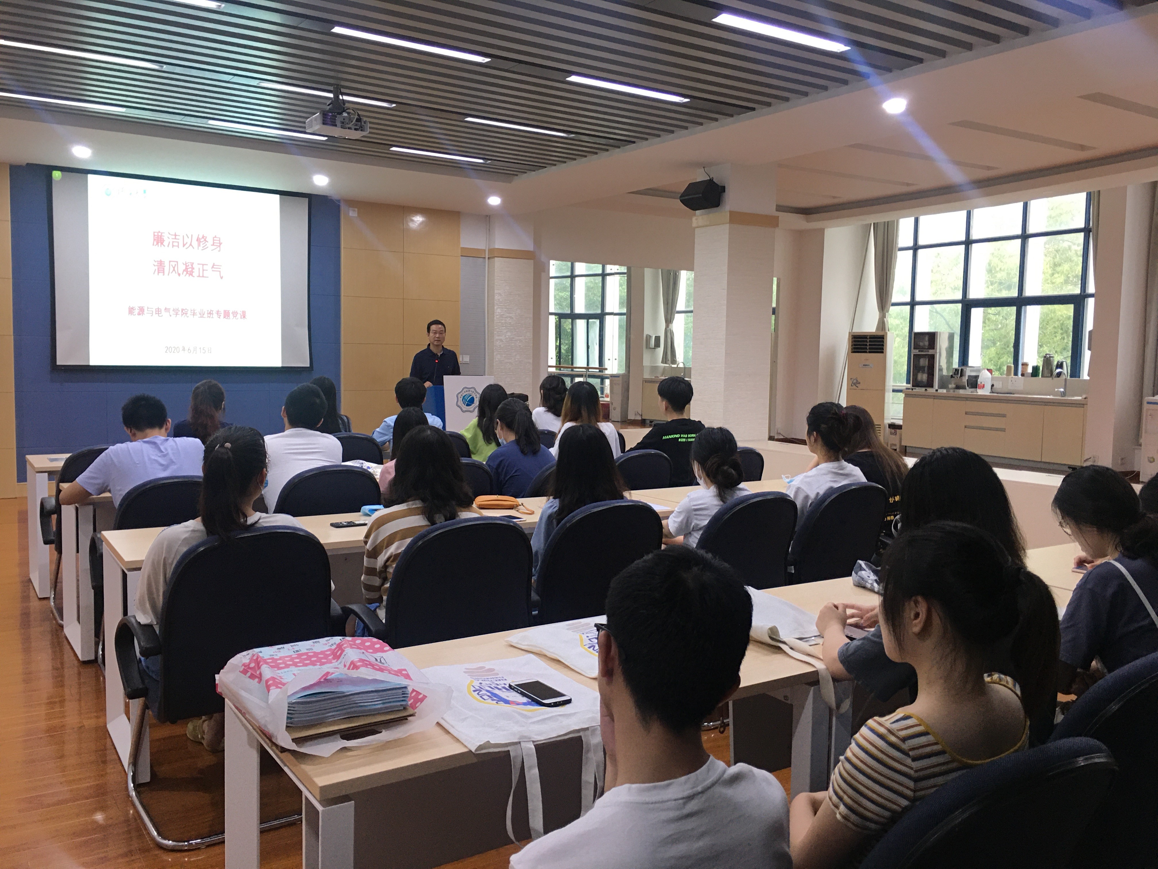 2020届本科生毕业前夕,能源与欧美性爱 开展了以“廉洁以修身,清风凝正气”为主题的专题党课。学院党委书记娄健主讲,全体毕业班学生党员参与学习。
