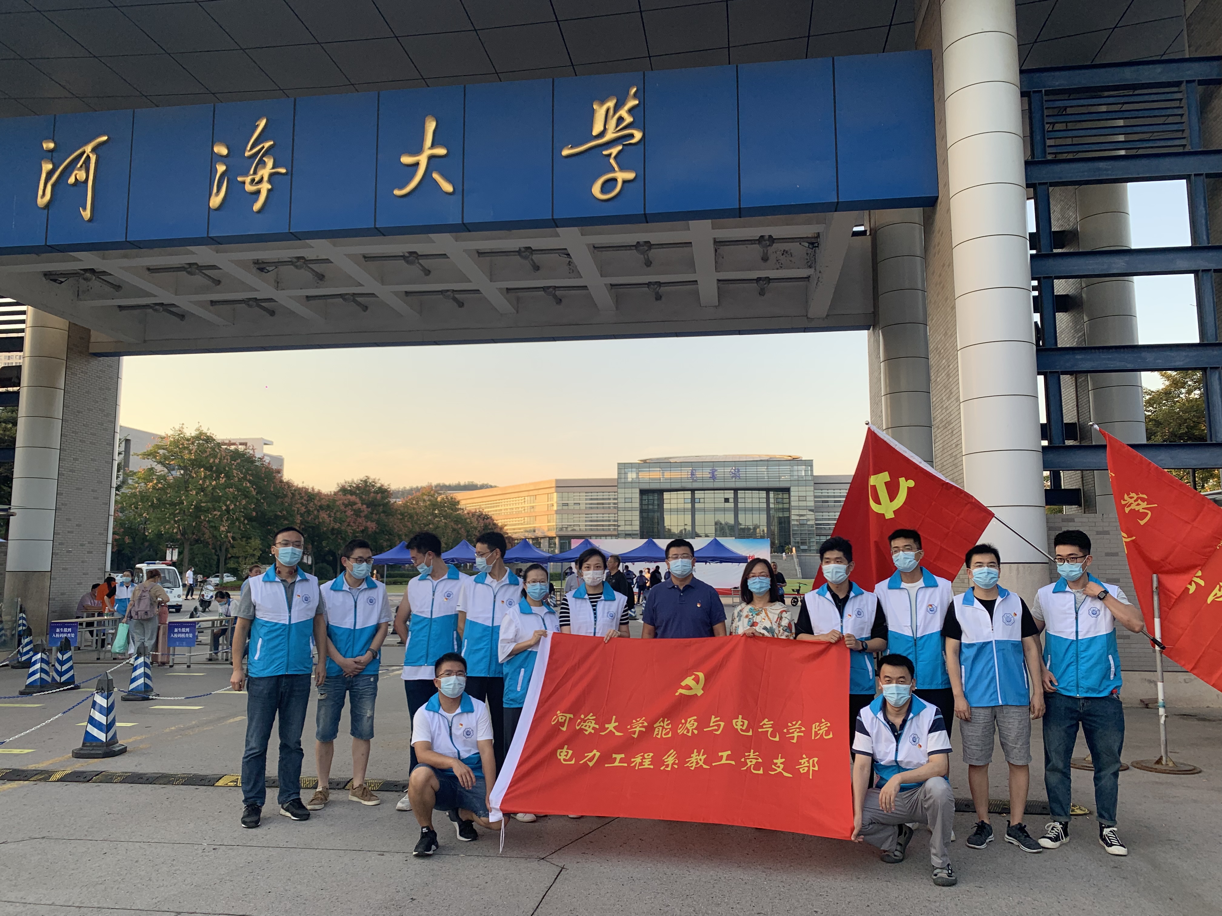 根据学校疫情防控工作整体部署和保卫处具体安排,9月22日晚间,能电院电力工程系教工党支部组织15名党员志愿者开展“防疫育人双结合”党员先锋行动,在江宁校区南大门树起党员先锋岗、责任区,把好学生安全入校“第一关”。