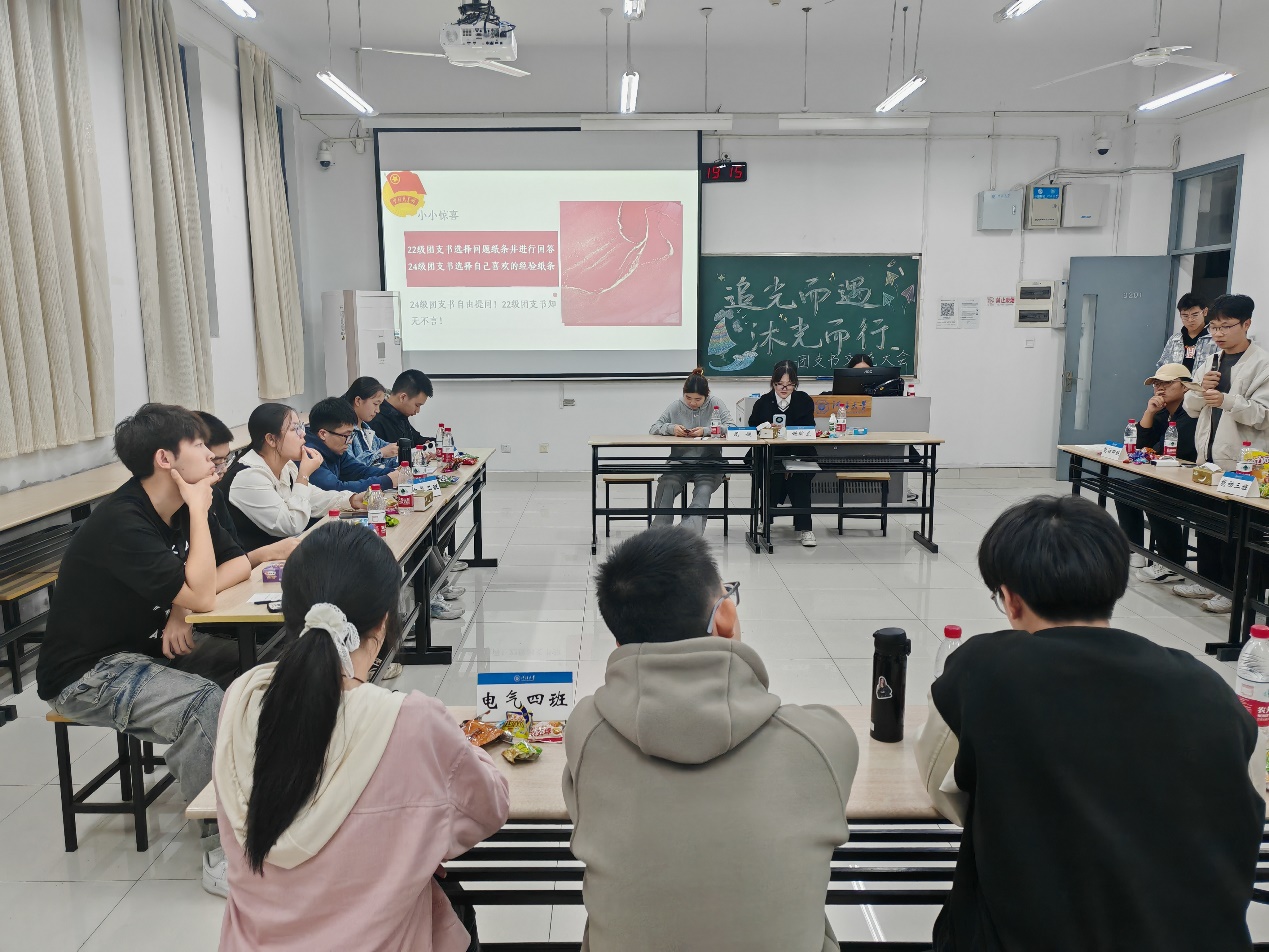 在团支书交流会中,经过有趣的串名字环节,大家对彼此有了一个初步的了解。24级的我们在明信片上写出来自己在团支书工作上的疑惑和不解,同时也收到了来自学长学姐的工作经验和善意的提醒。22级的学长对我们最关心的“如何办好团日活动”这一问题进行详细的指导,我们都受益匪浅。在一片欢声笑语中,我们拉近了与22级学长学姐和24级同学的关系,也找到了团支书工作的方法,结识了新的朋友。在今后的工作中我们也会凝心聚力,团学共进,在一次次的工作与交流中共同成长,成为一名优秀的团支书。