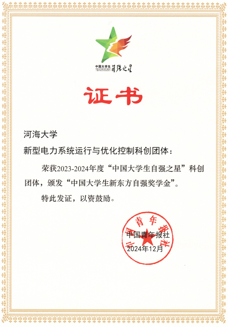 新型电力系统运行与优化控制科创团体荣获“中国大学生自强之星”科创团体(全国仅100支科创团体获得该荣誉)。